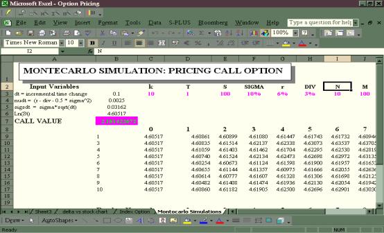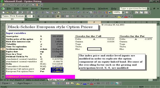 In additional to using the numerical Monte Carlo pricing technique for path dependent, American, plain vanilla and other more exotic type of options, a European style option can also be priced by using the Black-Scholes pricing framework. As the screen shows, to price the latter option, one can see all the required parameters to price the option and the cells from C4 to C12 can be used to input the required parameters. The result output for both the call and the put for the same underling can be observed from cell 17 and 18. As an exercise change the input parameters and see the impact of the option premium with respect to these changes. In fact, one can use this pricing technique to price similar option that is also attached to other assets such as capital guaranteed products. For detailed discussion on this see the article by Abukar M Ali, "Equity Linked Notes: and Introduction to Principal Guaranteed Structures", Journal of Bond Trading & Management, Volume 1, Number 3, January 2003. |